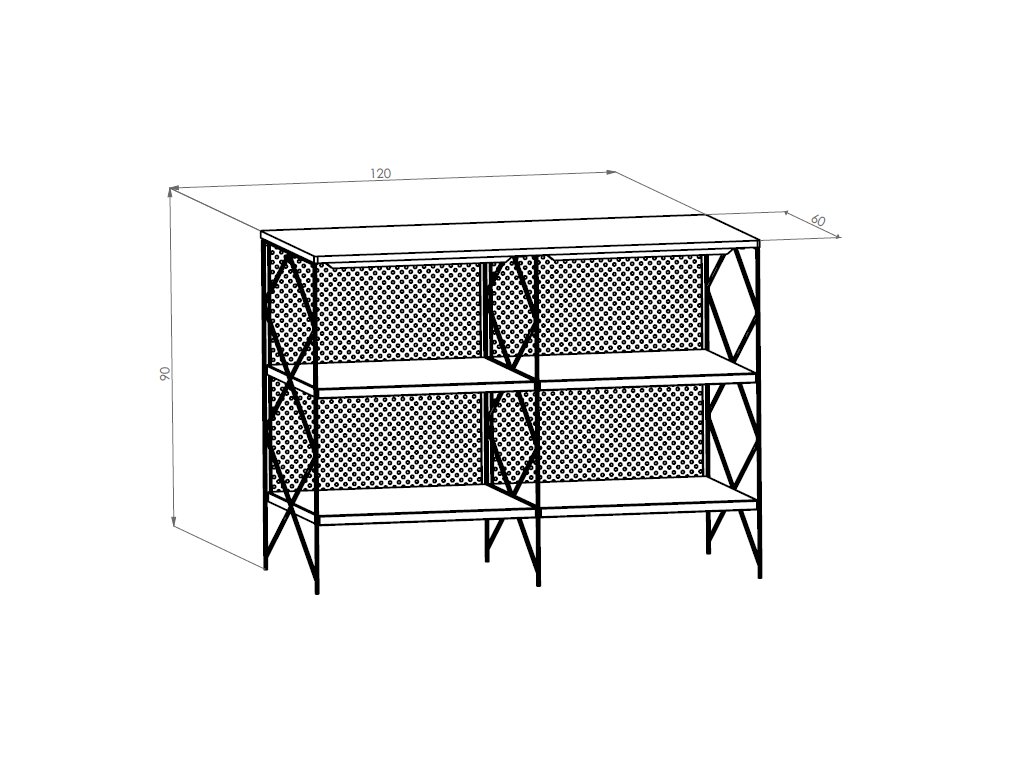 Skříňka je vybavena otevřenými policemi, které nabízí dostatek prostoru pro uložení nádobí, kuchyňských potřeb nebo dekorací. Perforované zadní panely přidávají na vizuální zajímavosti a umožňují lepší cirkulaci vzduchu.